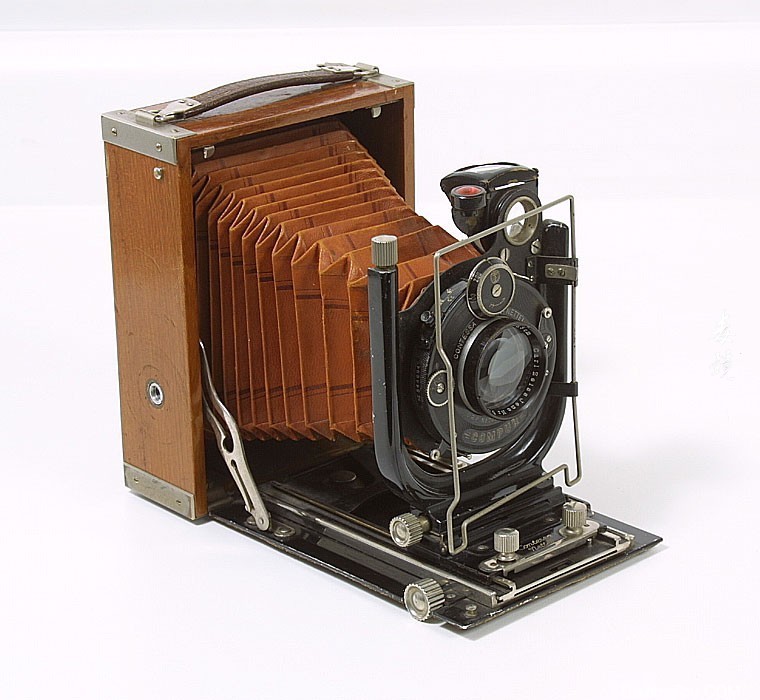 Adoro是一款落地折叠板式照相机,以皮革覆盖的木材制成。它具有双伸缩风箱,带有可放下的床,可用于广角镜,前上升和下降,后摆和倾斜以及机架对焦。仅适用于Zeiss Tessar镜头和Compur快门,尺寸为6.5 x 9cm,9 x 12cm和10 x 15cm。