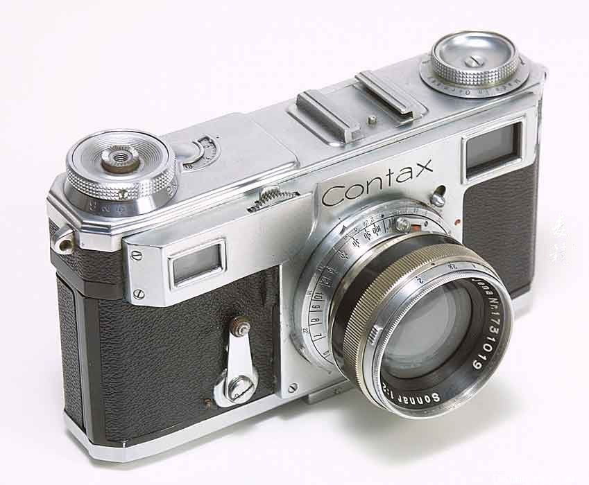 配备50/2 Sonnar过渡镜的Contax II。请注意,镜头是黑色和镍铬合金前面板,并使用与黑色和镍铬50 / 1.5 Sonnar相同的镜筒。