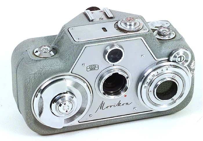 战后的Movicon 8是一款具有非同寻常设计的业余级双8电影摄影机。薄膜扭曲了90度,因为薄膜平面垂直于正常位置。这使相机具有独特的外观,镜头位于普通电影摄影机的侧面。