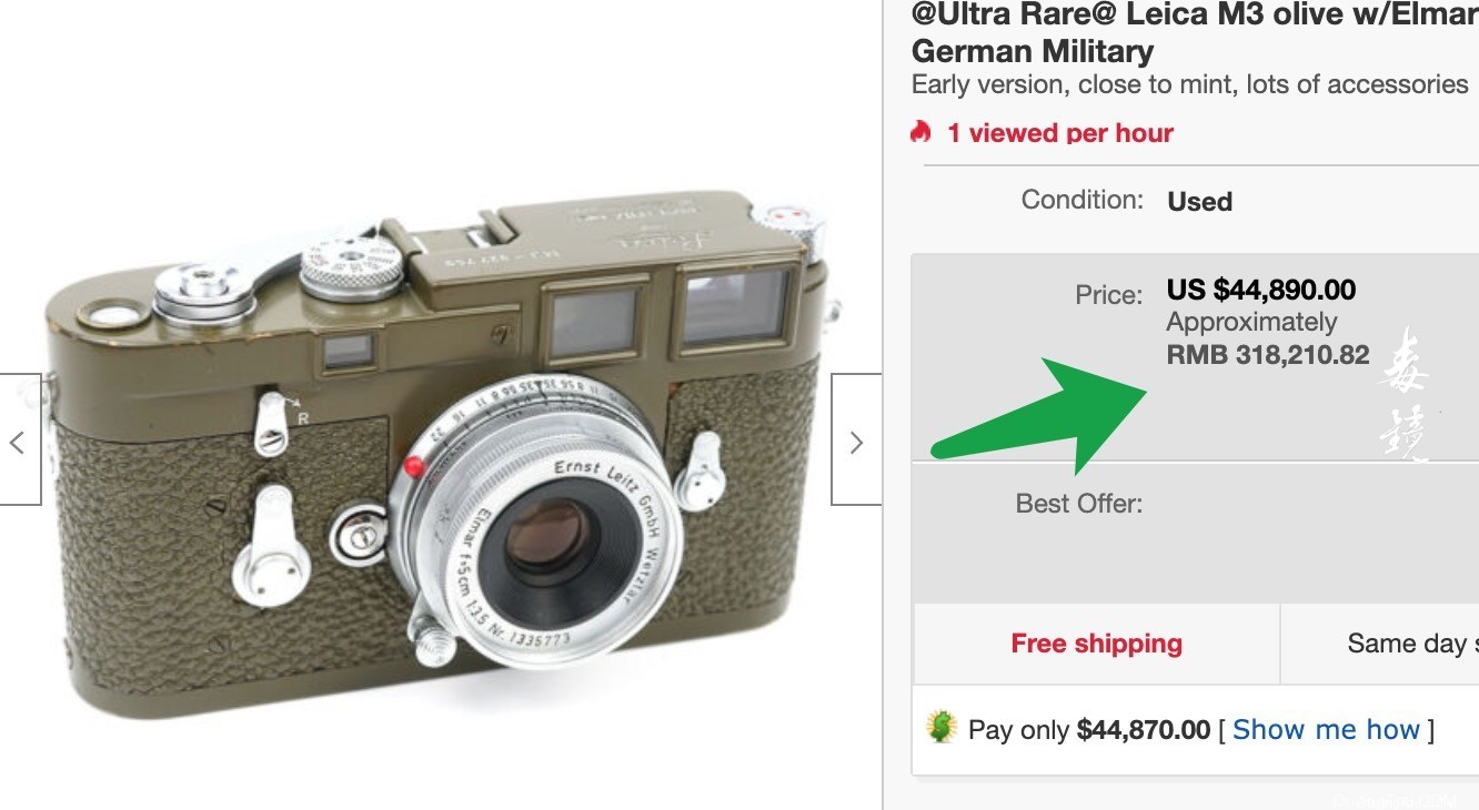 这一套全套军版徕卡M3 是来自ebay的销售中的图片,来自香港的商家,涵盖了能见到的大多数配件。相机背包、135镜头 测光表包等,现在很少见到这么全的了。