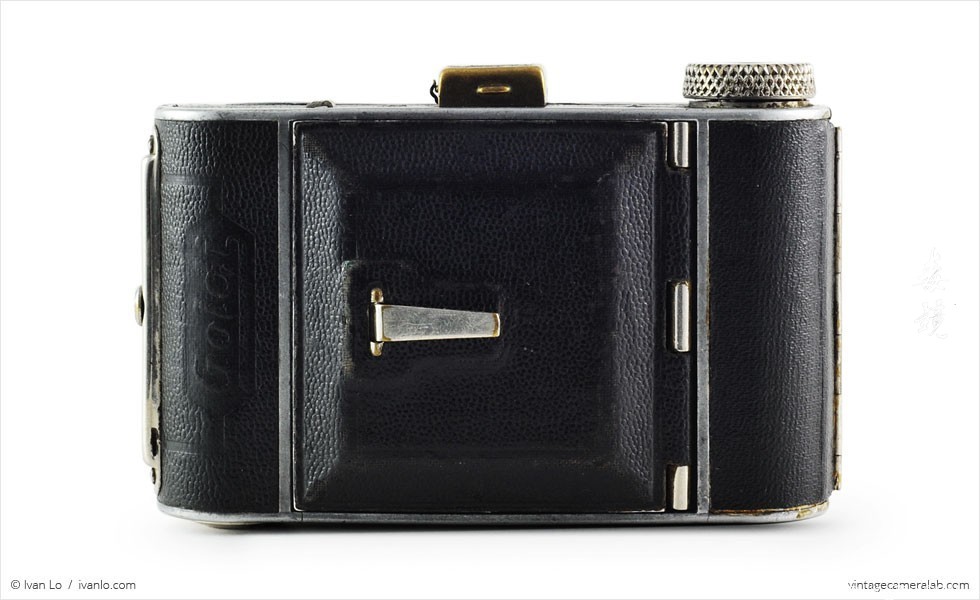 顶板上的镜头释放按钮旁边是一个向上取景器,旁边是滚花胶片前进旋钮。镜头门上有一个支架,旁边的人造革上刻有“ Goldi”名称。底板上有一个3/8英寸三脚架插槽,侧面有一个滑锁,用于打开相机的后部,背面有两个红色的窗口,用于跟踪帧号。