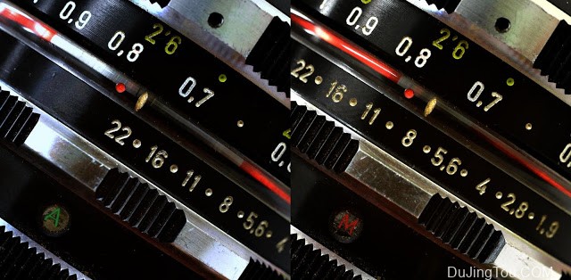 圆形框架中的显示与光圈机构的MANUAL / AUTO选择器开关一起在A和M之间切换。此外,景深的量表显示会与光圈冠一起变化。
