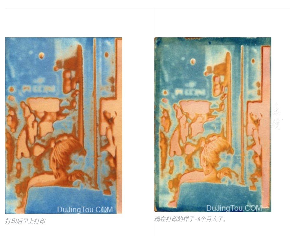 我选择等待,只是看看随着乳剂继续相互竞争,印刷最终是否会变得更加复杂。我把这个例子老化了八个月。蓝绿色正在卷土重来,而Vandyke的中色调变得更加苍白,并且使印刷品中最浅的部分呈现出特殊的粉红色。我的一些实验性印刷品开发出了一种奇特的绿色补丁,其中的乳剂都顽固地占据了地面。在另一些产品上,我让Vandyke乳液漂白了氰型很长时间,以至于最终印刷品中没有清晰可见的图像。在我的许多印刷品中,印刷品的Vandyke部分似乎像锈一样散开。