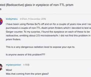 这里的另一个问题是有些镜头比其他镜头更具放射性。如果没有盖革计数器,就很难知道你在对抗什么。其次,摄影师是习惯的生物。有些人将镜片戴在身体旁边,总是在同一个地方。例如,我的镜头放在沙发旁边的架子上,我在那里阅读了几个小时,有时甚至睡着了。人们轻视这种暴露——对于某些镜头来说是有充分理由的——但存在很大的风险因素。有很多这样的镜片,你的身体每天肯定会吸收更多的辐射。