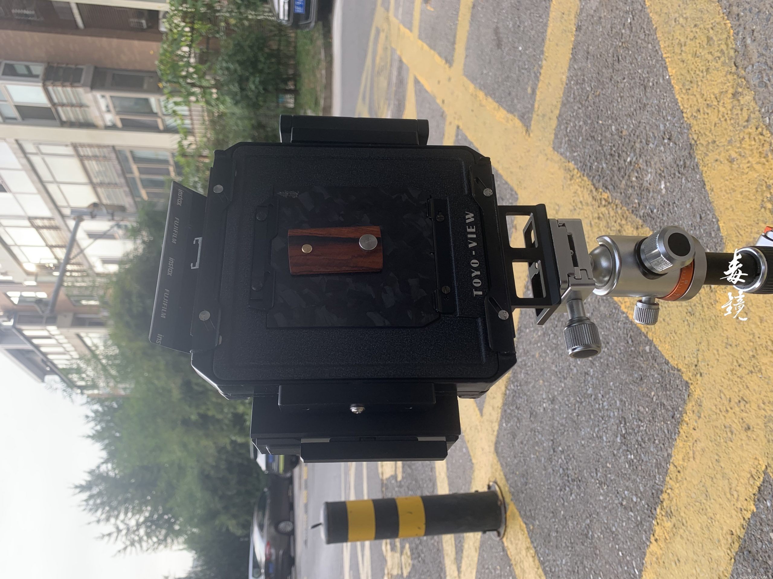搞了一台用toyo 45的后组改装的快拍机,我在前面放了一个星座转林板的转接板,然后做了个简单的针孔快门。后面接拍立得wide转4×5的后背,这样就有了个一个焦距在40mm左右的针孔相机了。