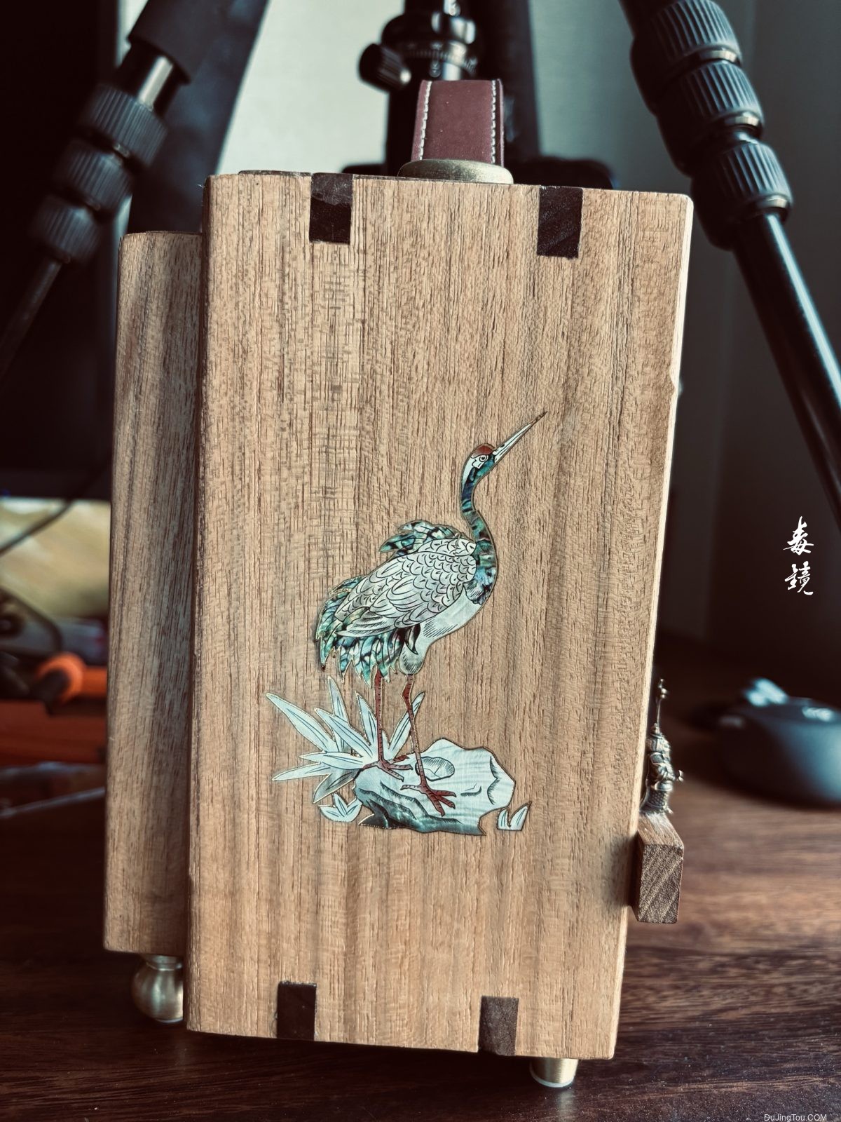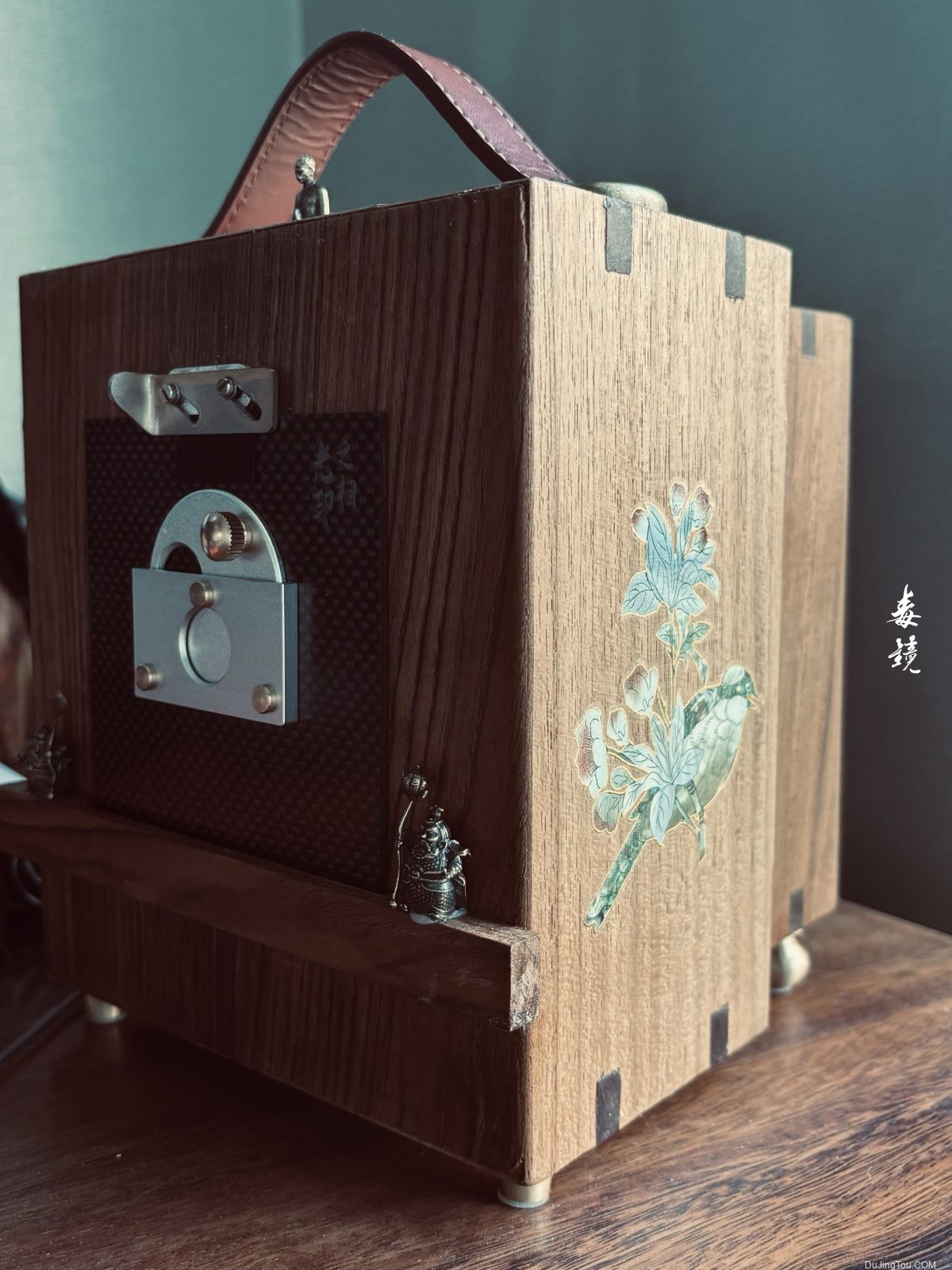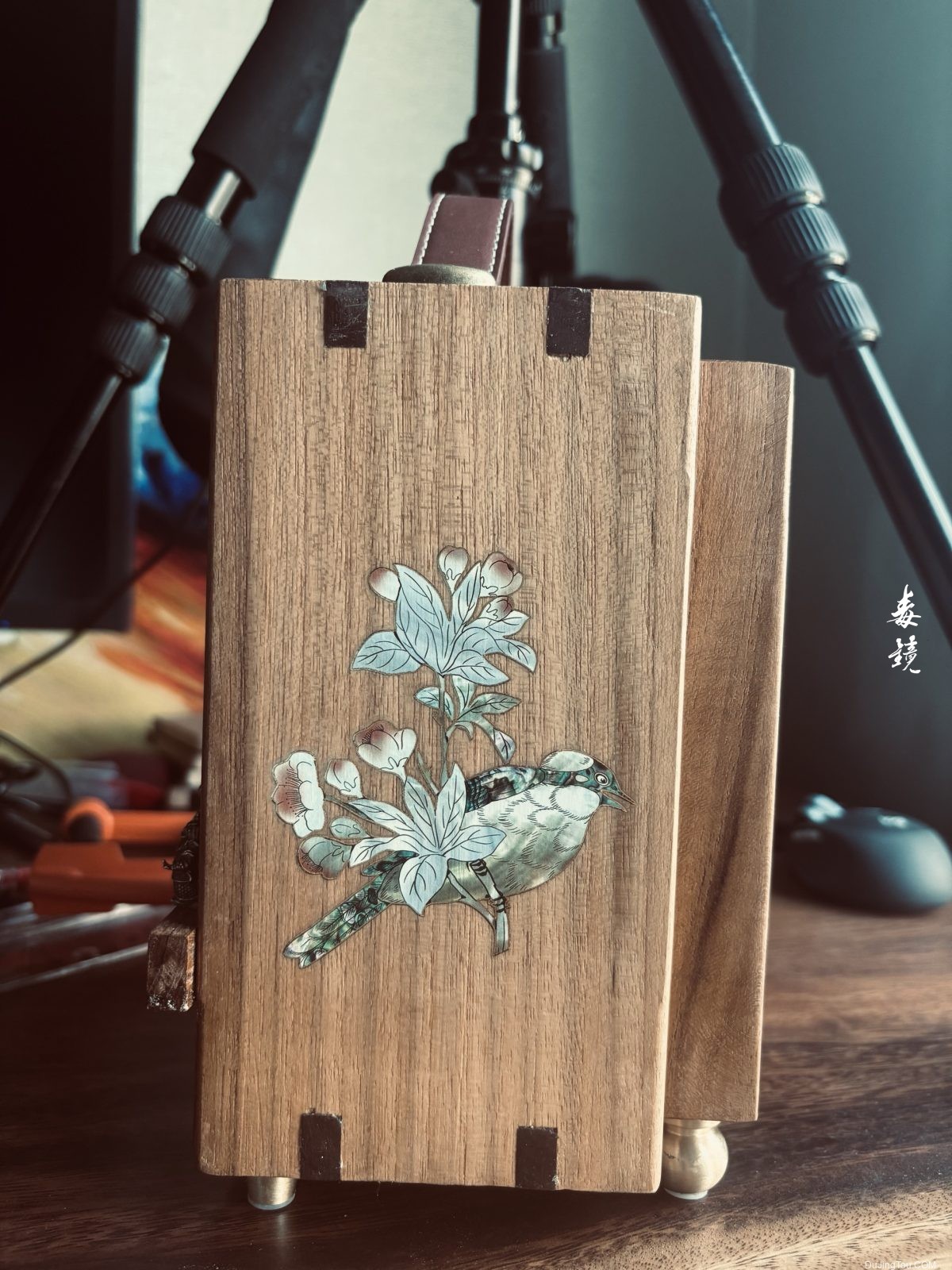 装饰部分很是用心,增加了几个金属的人物,侧面采用了“螺钿工艺”镶嵌了花鸟画面。底部采用了黄铜的四个金属支柱,质感效果好了不少。