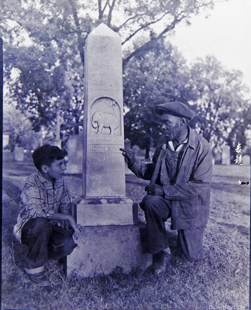 这张照片来自一张4X5画幅的底片上,从一组来自哥伦布市五十年代的照片中挑选出来。画面中一个墓碑上面雕刻着一只大象,这吸引我了。根据 墓碑的名字“约翰·金” 我们找到了这块墓碑的故事。