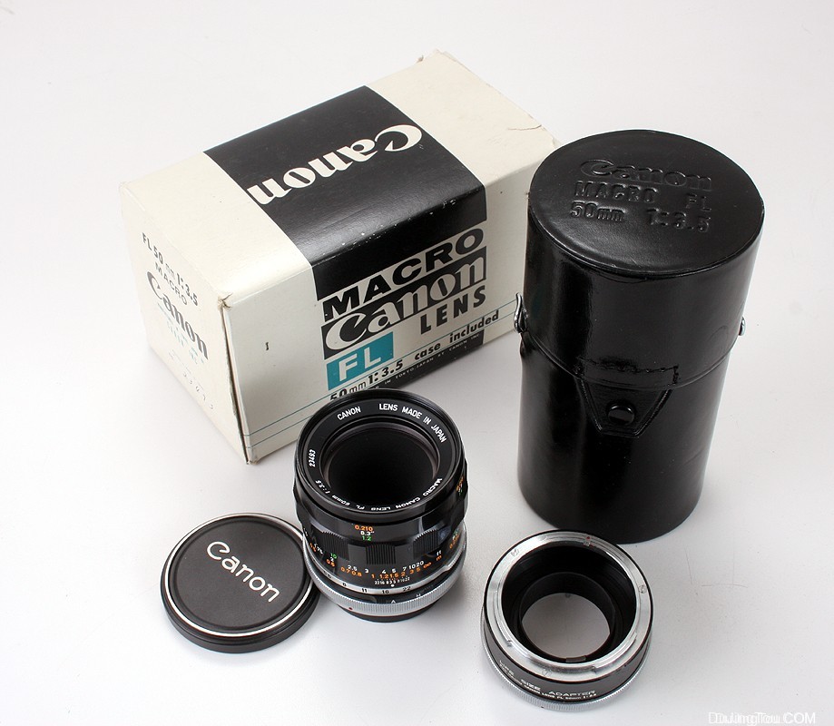 尼康首先在rnagefinder时代创建了一款用于微距工作的镜头,并于1961年为其反光相机推出了一款镜头。佳能在1965年推出了自己的微距镜头。在某些方面,它是对尼康当前产品的改进,还有更多与尼康在1966年推出的镜头极为相似。这是一个50毫米镜头,带有长焦距螺旋线,可对焦至半衰期。它配备了一个匹配的延长管,使其可以1:1聚焦。在镜筒上,镜头的底部装有标准的聚焦刻度,而在前镜筒上则使用了刻度,以显示调节后的聚焦距离和再现率。